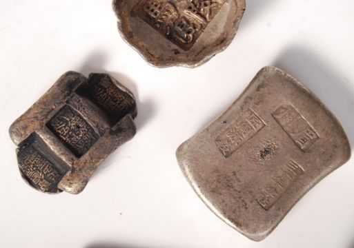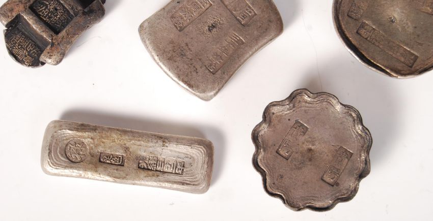 An unusual collection of Chinese coin casting moulds - mother coins. Each appearing to be constructed from low grade silver having individual shapes and character marks. 7 in total.