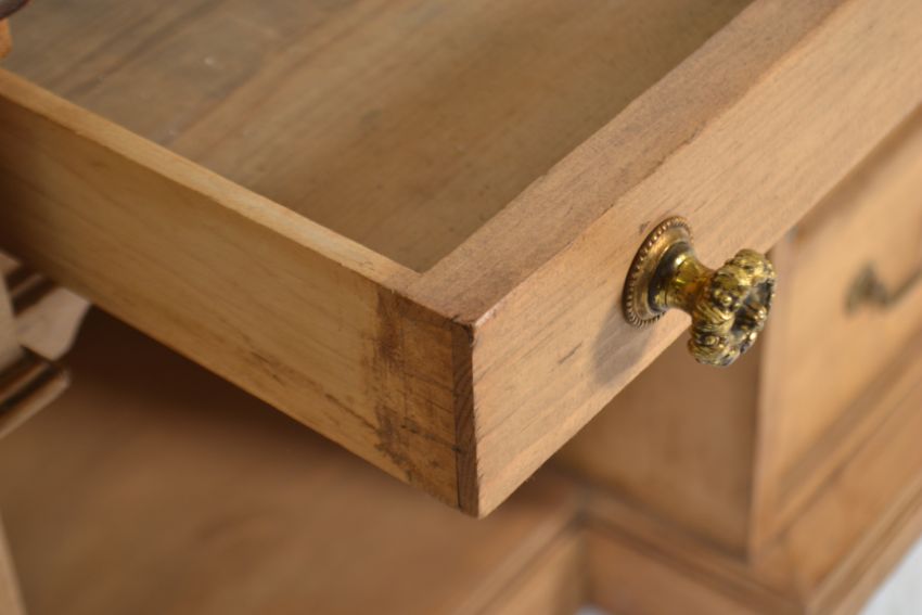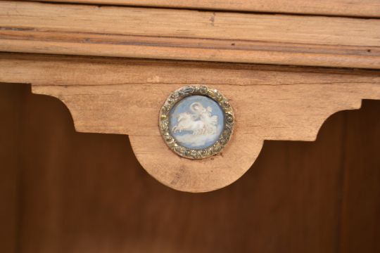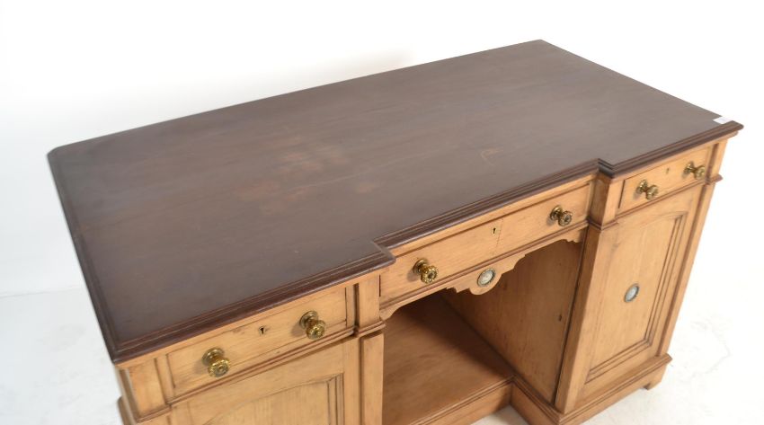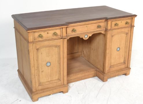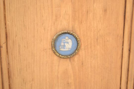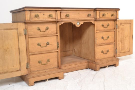 A 19th Century Victorian ash wood desk having a central knee hole recess with step. Flanked by two cupboards opening to reveal twin banks of drawers. Decorated with blue Wedgwood cameo jasperware plaques. Stripped back with painted top. Measures 75cm x 123cm x 59cm.