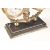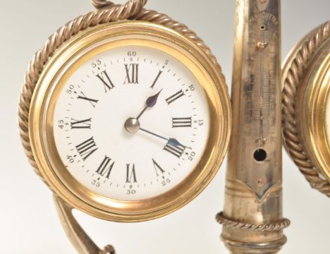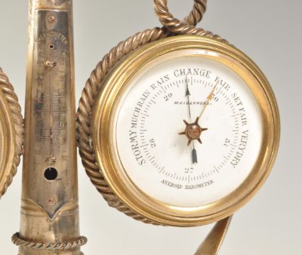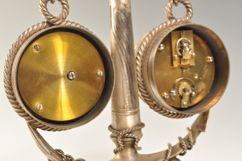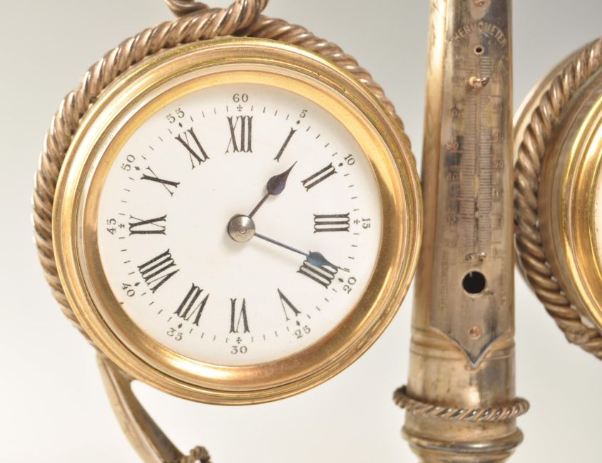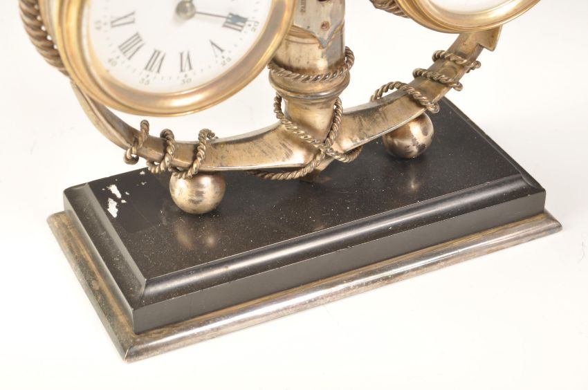 A late Victorian nautical theme desk piece compendium, circa 1900. Composed of a central anchor with thermometer tube and carrying handle with bale flanked by enamel clock dial with Roman numerals and an aneroid barometer. Raised on socle plinth base. The mercury thermometer tube missing. Measures 20cms high x 18cms wide.