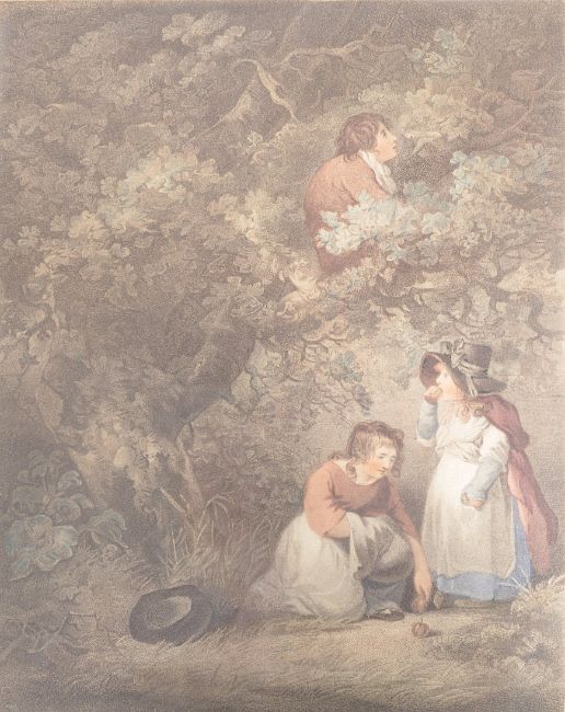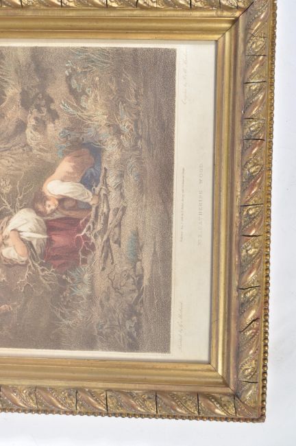 A pair of 19th century coloured engravings published by George Morland ( British, 1763-1804 ) & engraved by RM Meadows. Each with notation to lower centre and entitled ' Gathering Fruit ' and ' Gathering Wood ' Measures 42cms x 54cms ( Frames )
