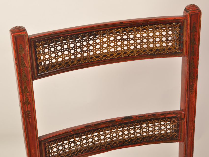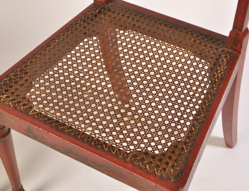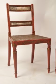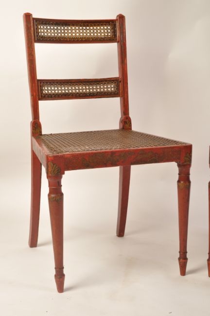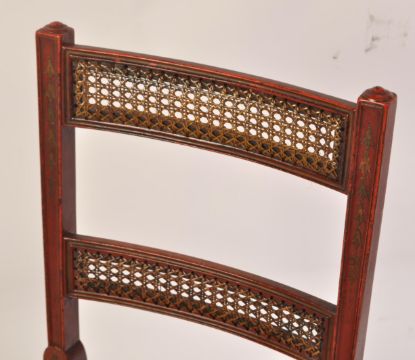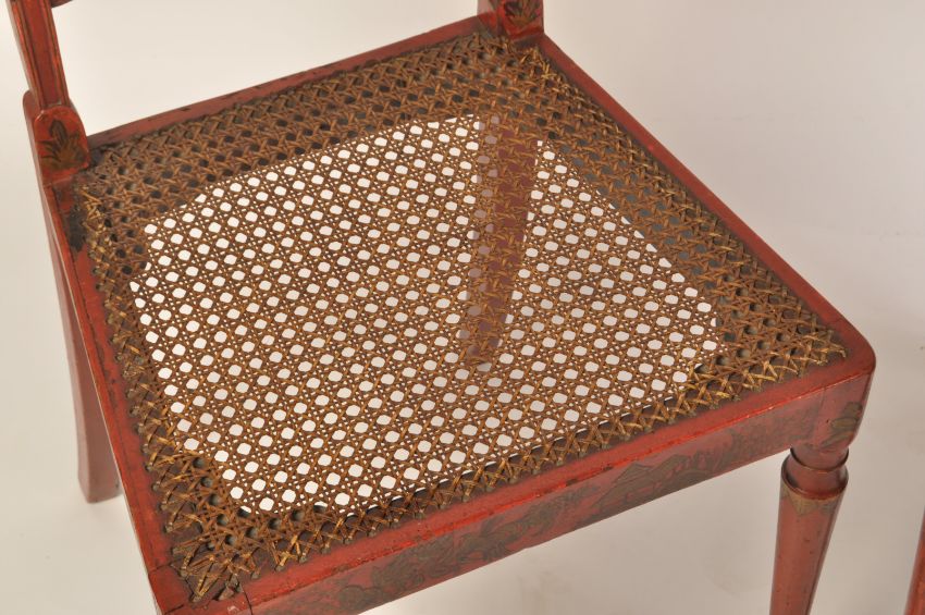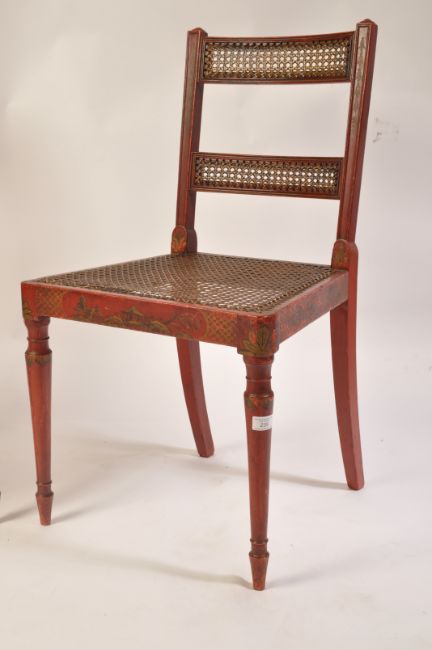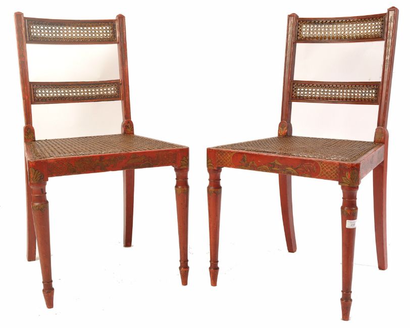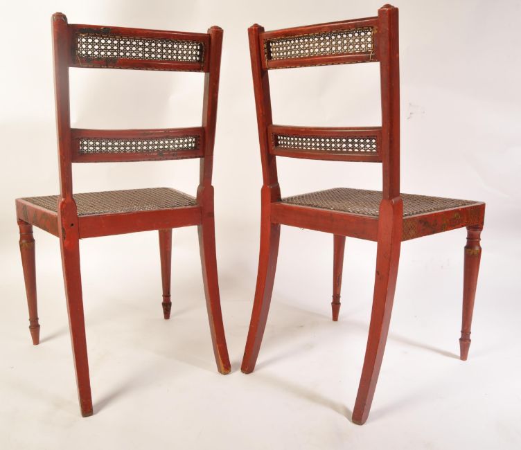 A pair of Regency 19th century George III red lacquer and chinoiserie decorated dining chairs having bergere cane worked seats and twin back rests.  Raised on turned legs with caned seat and twin bar caned back rests with stunning gilt chinoiserie decoration all over. Measures 88cms high x 47cms wide x 42cms depth x 44cms height to seat