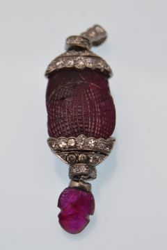 A Burma ruby and diamond necklace pendant. The pendant being formed of a large Burmese ruby with foliate carvings with further carved ruby pendant drop. The pendant having diamond set bale and collars. Gemological report supplied stating ruby is not heat treated. Total Ruby weight 19.94ct. Total weight 12.3g . Measures 5.4cms drop