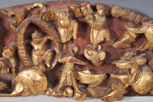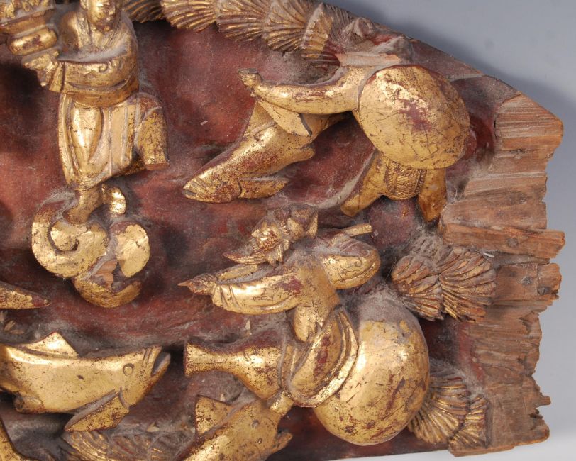 A Qing Dynasty 18th / 19th century Chinese gilt wood arched panel of a shaped form being profusely carved in relief with marked scene of traders, fish, basket, amphora, linens etc. Measures 59cms X 23cms