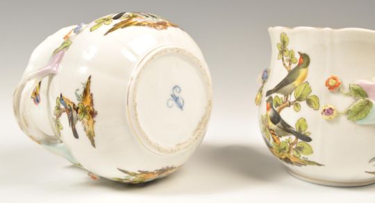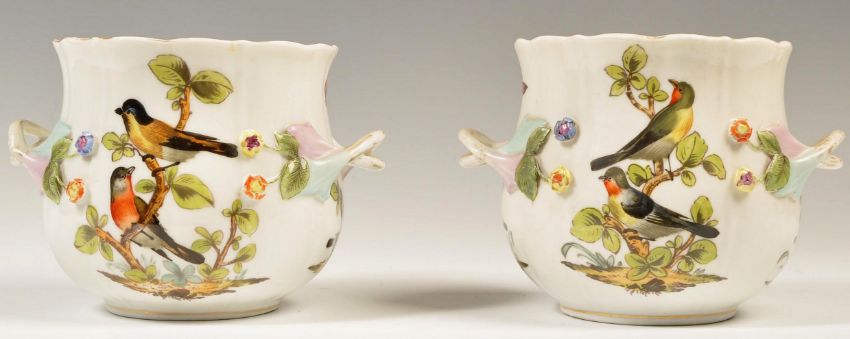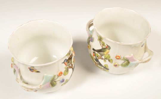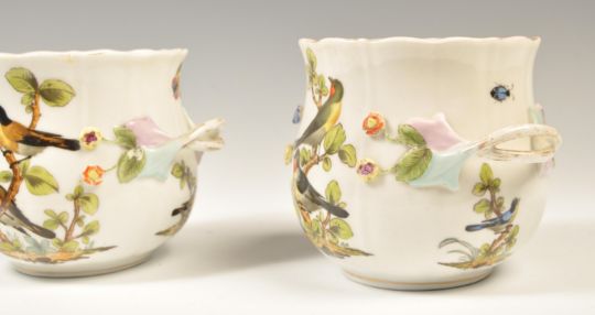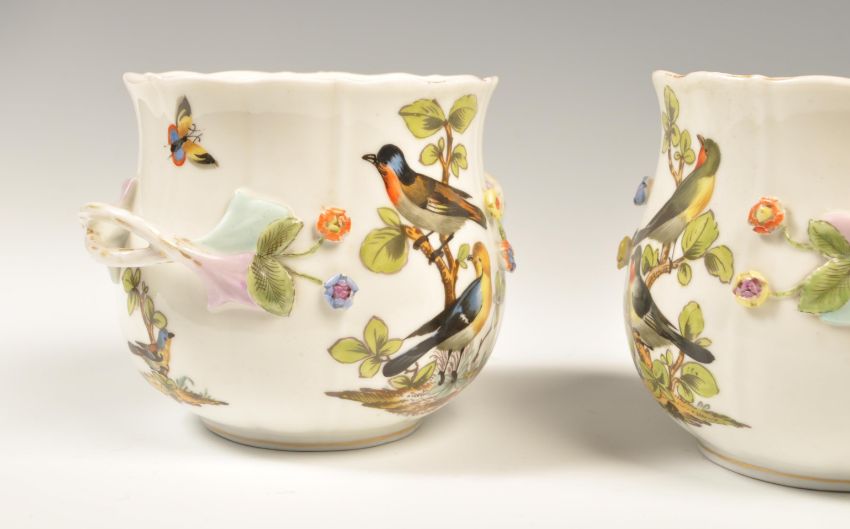 A pair of 19th century believed Dresden twin pierced handled ice pails or jardinières being painted in the Meissen style with AR ( court piece mark ) to base. Each with  decoratives scenes of birds perched in trees and vine with bugs and butterfly. Measures 13cms high x 17cms wide ( furthest point )