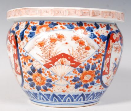 A 19th century Chinese Jardiniere - plant pot  in the Imari pattern having a ribbed and flared top with geometric patterns. Unsigned to the base. Measures 15cms high x 19cms wide