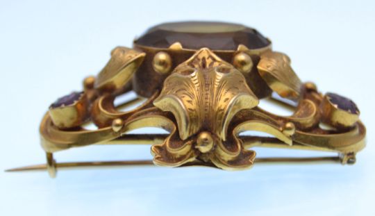 An early pre 1854 high carat gold Victorian citrine and garnet brooch having foliate scrolls and acanthus decoration completed with T bar hinge and C clasp. Measures approx 2inches. Weight approx 12g.