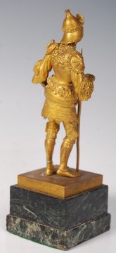 After Hans Muller (1873-1937) Austrian A 19th Century bronze ormolu statue of the knight Peter Discher raised on veined marble pedestal base with square plinth base. The knight stood to attention with poleaxe. Signed Peter Discher 1518. Measures 20cm high.