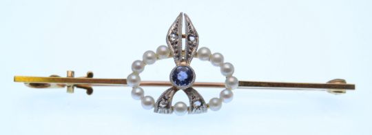 A Belle Époque sapphire, diamond and pearl brooch. The brooch having a rose cut diamond plume, set with a central blue sapphire surrounded by a halo of pearls in platinum flashed gold. Presentation case included. Weight 2.7g. Measures 5cms.