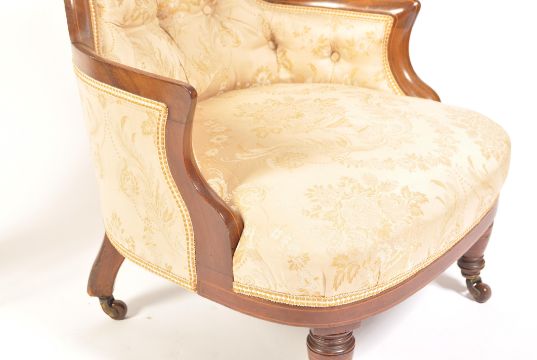 A late 19th century Victorian mahogany inlaid armchair of small proportions being raised on brown ceramic castors with ring turned legs. Above a shaped show wood frame with chenille upholstered seat and back rest. Measures 70cms high  x 57cms wide