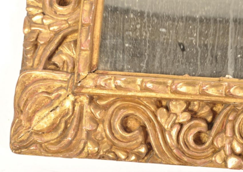An early 19th century overmantel mirror having a florentine manner ornate gilt wood  frame carved with scrolls and flowering branches with a gadrooned border. 77cms x 102cms wide