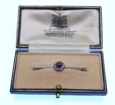 An early 20th century ruby and diamond cluster bar brooch. The brooch being set with a central  with a ruby cabochon surrounded by a halo of rose cut diamonds. Measures approx 1 1/2 inches. Weight 2.2g.