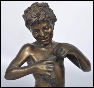 Vincenzo Cinque (Italian, believed 1885 - 1969) - A Gilt bronze statue of a cherub - putti boy with fish in a kneeling position set over a rock. Finished with a black veined stepped marble plinth. Signed to the rock corner. Measures 48cms high  x 25cms wide x 15cms depth