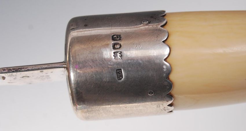 A late Victorian silver London 1900 hallmarked and marine ivory handled page turner by G H James & Co (George Henry James) Of large form with silver handle and collar being hallmarked for. Measures 41cms long