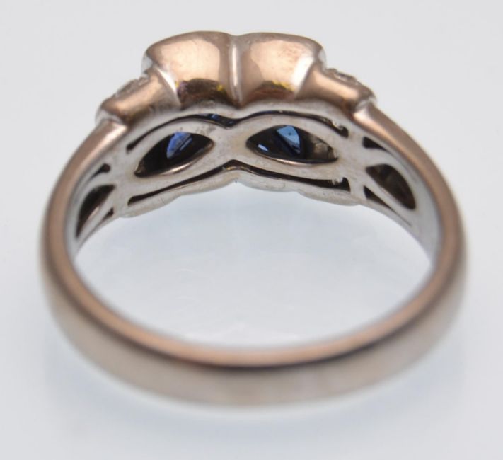 An 18ct gold sapphire and diamond ring. The ring having fancy cut blue sapphires set in a kiss motif with round brilliant cut diamond accented shoulders. Estimated sapphire weight 1.30ct. Estimated diamond weight.20ct. Total weight 7.1g. Size N.5.