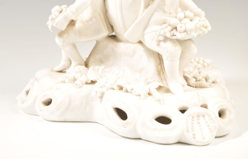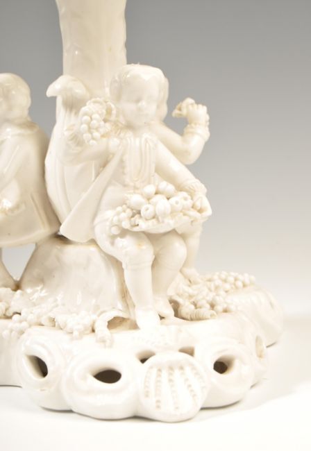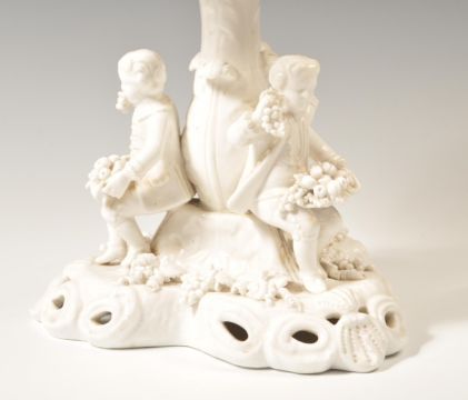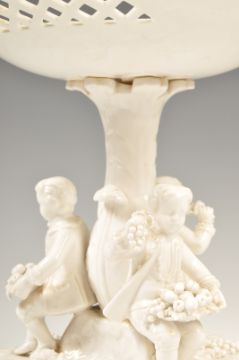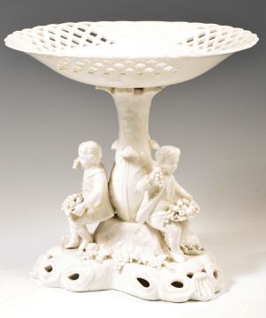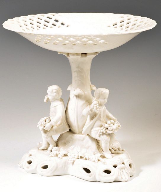 An 18th / early 19th century Derby ( 1795 - 1830 mark ) large tazza centrepiece. The pierced rim bowl atop 3 classically dressed young boys with fruit baskets and grapes. Set over pierced trefoil base embellished further with grape benches. Blue mark to base as above. Measures 24cms high x 25cms diameter top