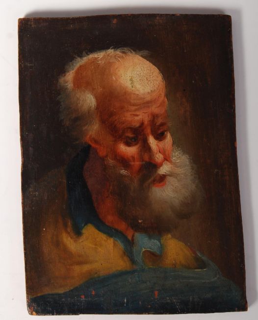 A 19th Century oil portrait painting on wood depicting a bearded elderly man wearing yellow and blue coloured robes, possibly being an interpretation of St Peter, having an animated expression and painted with a fine brush giving exquisite detail reminiscent of the Dutch school of painting after Rembrandt. The piece appears to have been cut down from a larger work or object. Measures 13cm x 9.5cm.