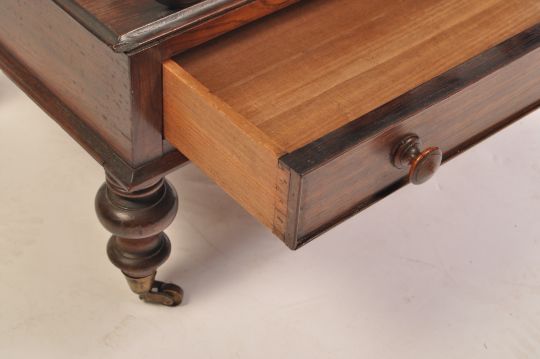 A 19th century Regency rosewood canterbury - magazine rack being raised on turned legs with brass castors. Above a single frieze drawer with sectional top having central carved shell. Measures 47cms x 51cms x 36cms