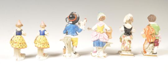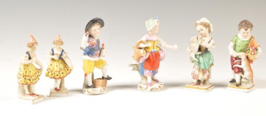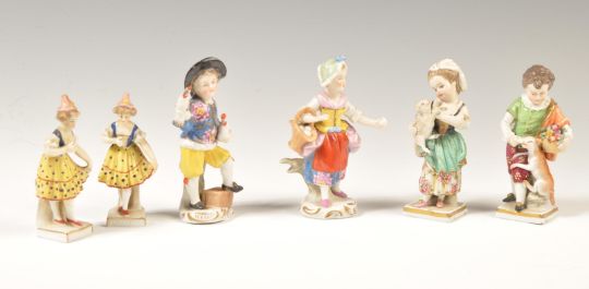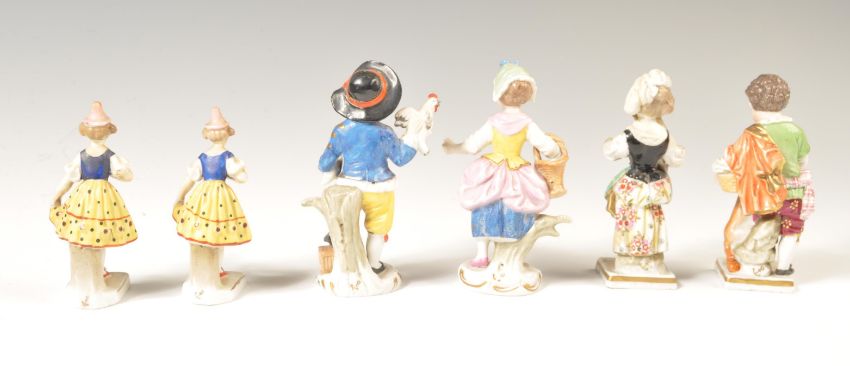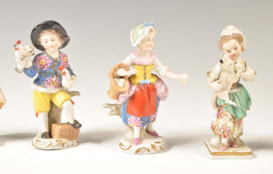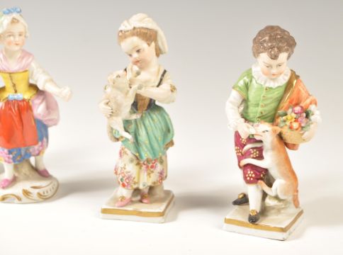 A collection of 19th century Samson of Paris porcelain figurines. To include a boy with cockerels and basket to feet and matching girl with basket of eggs, girl feeding a lamb, boy feeding a dog with basket of flowers in hand. Also a smaller pair of Bavarian dancing  Fraulein's. All with gold anchor marks to back. Tallest measures 11cms high