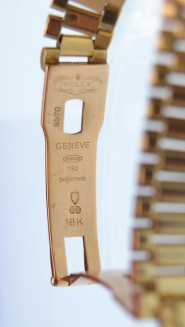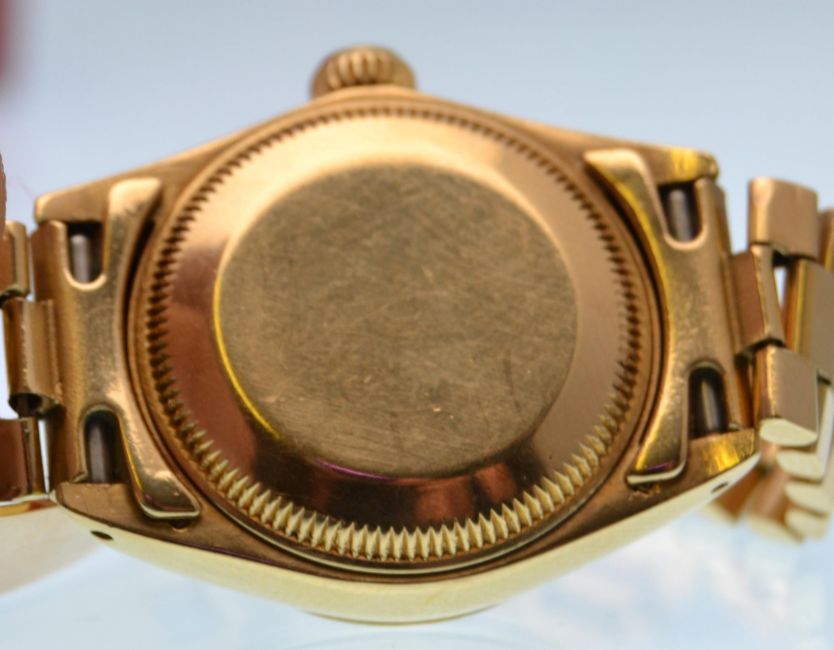 A lady's 18ct gold rolex Oyster Perpetual Datejust Superlative Chronometer officially certified wristwatch. Model number ' 69278 '. Satin-finish champagne dial 20mm diameter with baton markers, magnified date aperture and centre seconds hand in a gold case with stamped serial number. Set to a ' President ' bracelet numbered '8570' Complete in presentation case with cushion. Total weight 68g