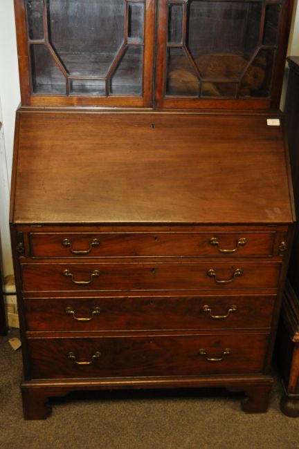 A good 19th century George III mahogany bureau bookcase being raised on bracket feet with bank of drawer under bureau above. Appointed interior within. Finished with twin door astragal glazed bookcase cabinet atop having stunning large arched swan neck pediment ( removes ). Dismantles into 2 pieces. Measures 230cms high x 83cms wide x 53cms depth