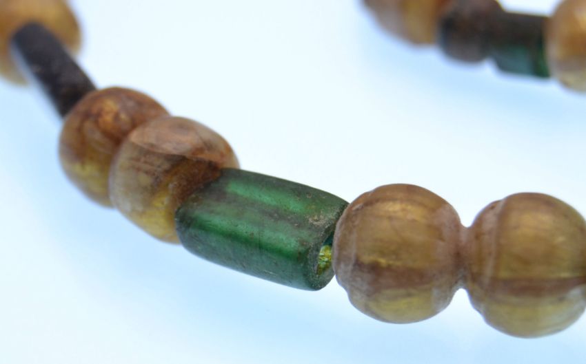 A string of Roman green and gold sandwich glass beads. The beads believed to be of Roman origin having twin and single round gold sandwich glass beads and long brownish red  and emerald green glass beads being highly included. The beads being strung together on a modern silk strand. Measures 31inches total. Weight approx 56.8g.