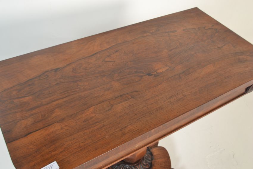 A Regency 19th century Irish / Scottish  rosewood card - games table being raised on a hexagonal tapering column with quadruped base having flip over table top. Measures 73cms high x 91cms wide x 45cms depth