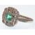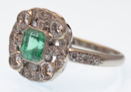 An Art Deco white gold emerald and diamond ring. The ring being set with a central emerald cut emerald within a quatrefoil halo of diamonds having tapered diamond set shoulders. Emerald measures approx 6mm x 5mm. Estimated diamond weight 0.80cts. Unmarked. Weight 5g. Size M.