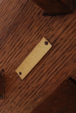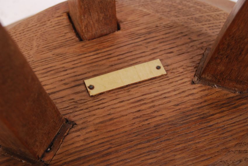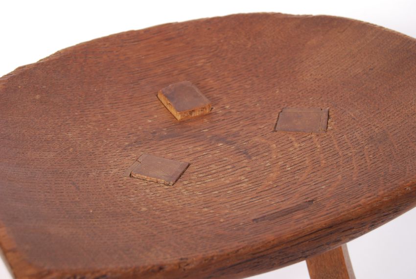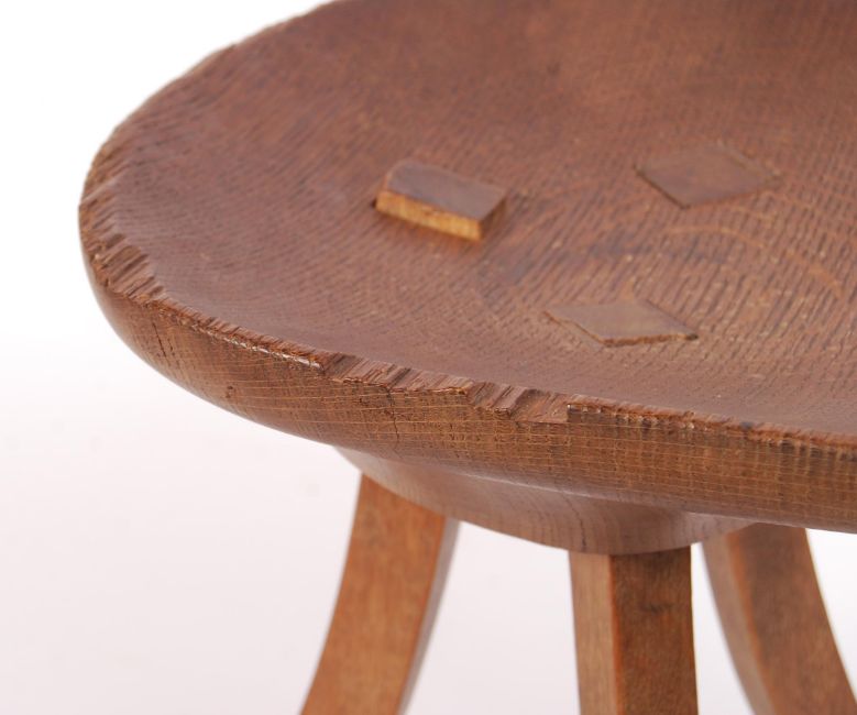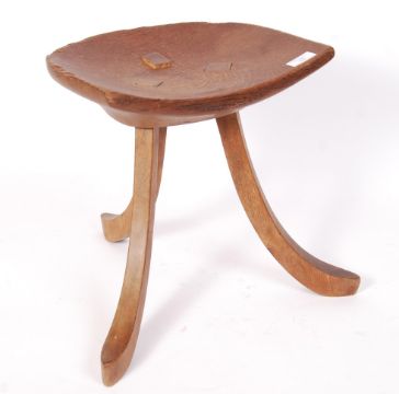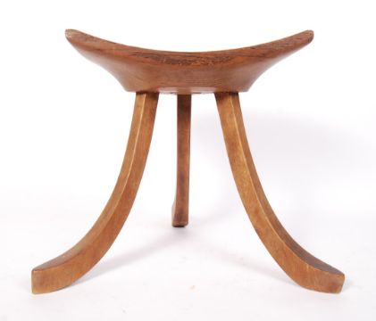A late 19th century Victorian Liberty & Co of London ' Thebes '  stool. The Arts & Crafts stool with a saddle seat on three splayed legs terminating in pointed feet. Ivorine plaque to the underside, Liberty & Co Ltd, London. Measures 37.5cms high x44cms wide ( at feet )