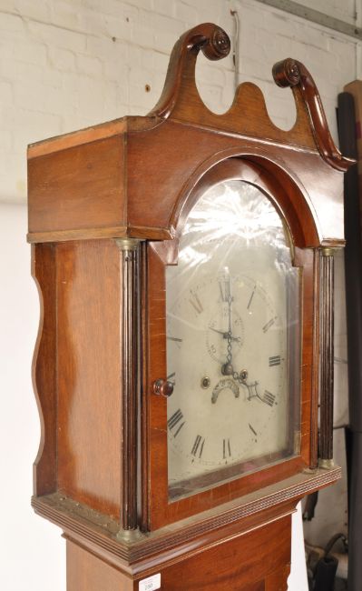 A West Country 19th century George III mahogany longcase clock by John Stratton of Devizes. Plain painted face having roman numeral chapter ring enclosing hands and subsidiary dials for calendar and seconds. Good trunk with swan neck pediment to the glazed hood. Complete with lead weights and pendulum. Measures 211cms high x 49cms wide