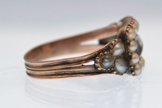 An early 19th century gold and half pearl memorial ring with a central woven hair panel on a reeded shank. Size N.