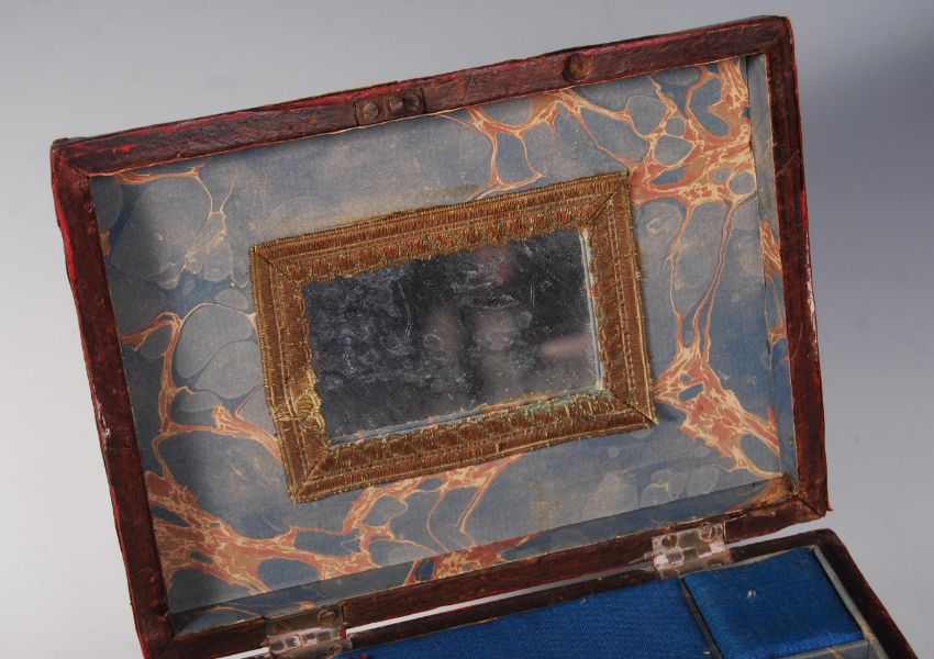 A Regency Moroccan leather covered workbox, of sarcophagus form being raised on gilt brass hoof feet supporting a leather tooled body with scalloped terraced top having finial roundel adorned top. Ring handles either side, the hinged top opening to reveal an appointed interior complete with lower drawer. Measures 13cms high x 19cms wide x 14cms depth.