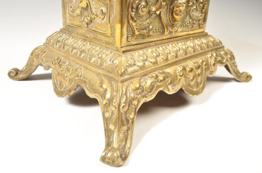 A 19th century French ornate brass mantel clock. The scrolled feet plinth with upright body having enamel roman numeral chapter ring, faceted hands with brass movement set within. The brass case with finial top and green man mask ring handles to the sides. Measures 41cms high 25cms wide x 21cms depth