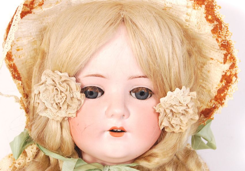 A beautiful antique late 19th / early 20th century Heubach Koppelsdorf made doll. Bisque head, with hand painted face, composition jointed limbs and body. Curled blonde hair, dressed in a period cotton and lace dress, with bonnet. Marked Heubach Koppelsdorf to rear, mould number 250-7. Largely in good condition for age, but an old crack around the left-side ear (see photos). Rare. Measures approx; 69cm tall.