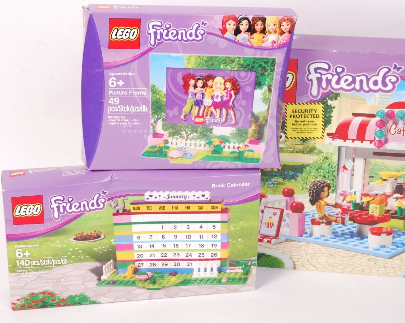 A collection of 4x assorted Lego Friends series boxed sets. To include; 3061 City Park Cafe (presumed 100% complete, but unchecked, resealed in original box), Friends Picture Frame (sealed), Lego Friends Brick Calendar (sealed) and Friends Pencil Holder (sealed).