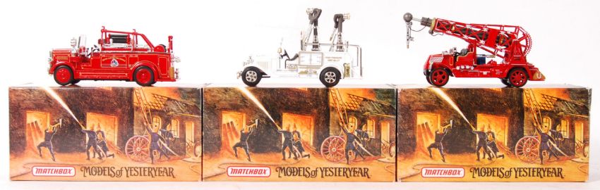 A collection of 3 x Matchbox Models Of Yesteryear Fire Engine Series scale diecast model vehicles to include; YYM37633 1920 Mack AC Water Tower Truck, YYM37634 1932 Ford Model AA High Pressure Truck, YYM37635 1935 Leyland Cub Motor Pump. All within their original boxes.