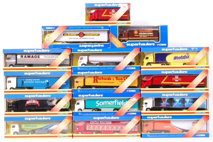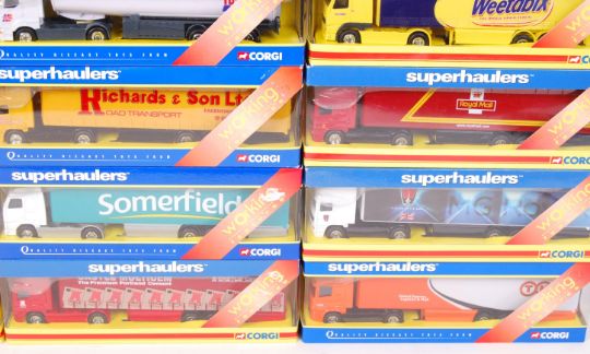 A large collection of 15x assorted Corgi Superhaulers boxed 1:64 scale diecast models. All advertising related, to include; Somerfield, BP, Weetabix, Ramage Transport Ltd and others. All models appear mint, within the original display boxes.