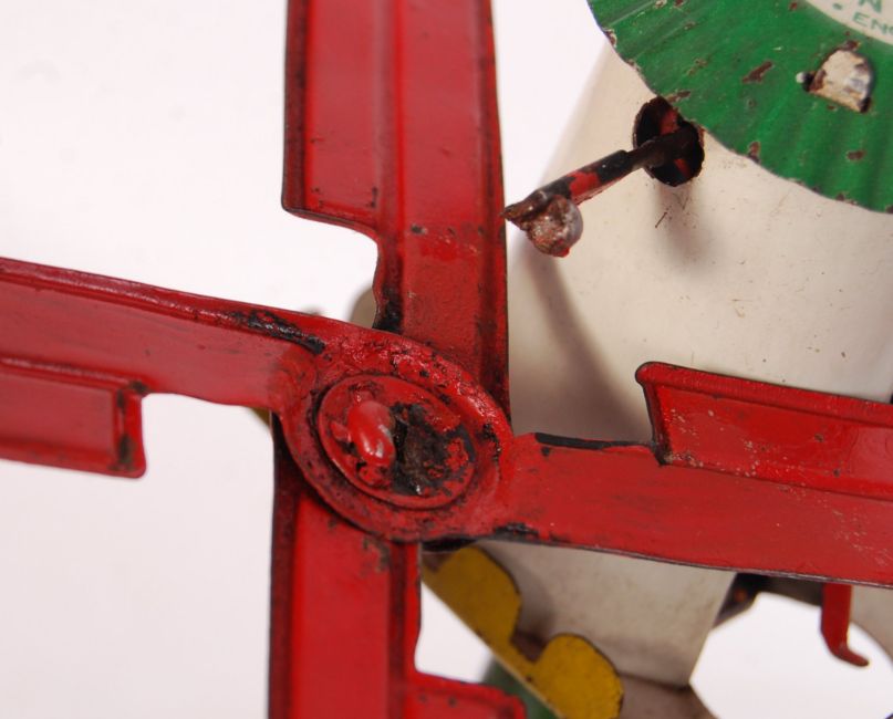 A rare late 1920's / early 1930's German ' Lehmann ' made ' Gustav The Miller ' toy. Comprising of a tall pole, with windmill to top. Gustav climbs the pole, retrieves the bag of grain and goes back down the pole. Complete, with slight AF to the windmill (the blades have had an attempted repair). Within a reproduction box. Rare and charming antique toy.