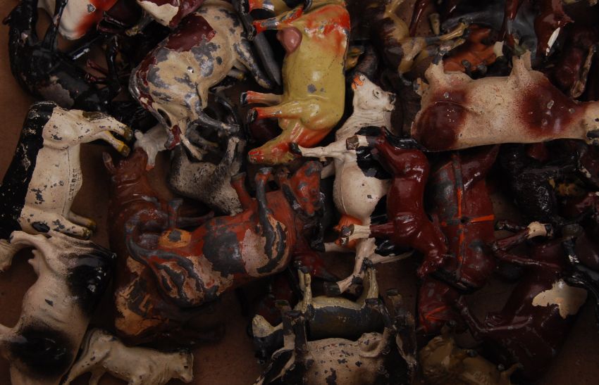 A good large collection of vintage Britains (some other makes present) lead farm animals. To include cows, goats, ducks, horses, etc. Many stamped ' Britains ' to base. Condition varies, but largely fair to good.