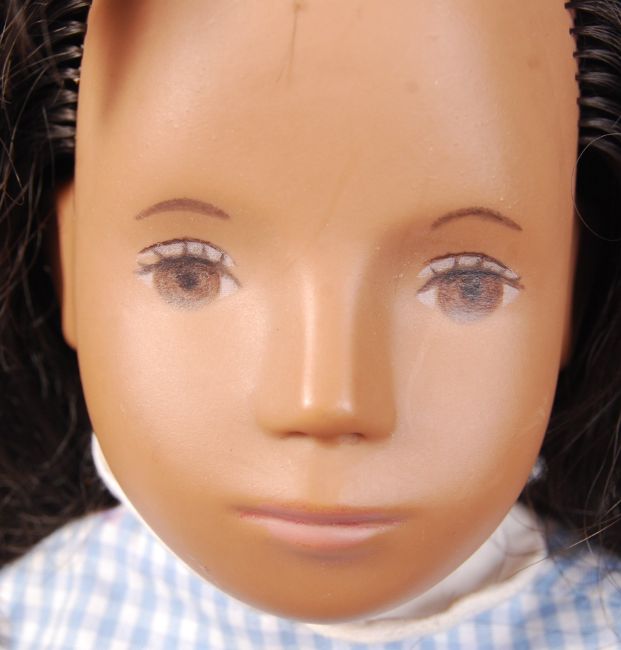 A rare original vintage 1970's vinyl Gingham Sasha Doll, with original clothing. Handpainted eyes and lips, with chequered blue and white dress, with shorts and underclothes. The head with long black hair. Measures approx; 42cm tall. Sasha dolls are a type and series of doll created by Swiss artist and dollmaker Sasha Morgenthaler (1893-1975), produced in Germany and the United Kingdom beginning in the late 1960s. Popular with collectors, Sasha dolls are characterized by their individualism, their realistic expressions, their unique colour, and the extreme attention to detail in the manufacture of the dolls as well as their clothes.
