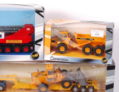 A collection of 5x Cararama 1:50 scale boxed diecast model hauliers / construction related sets. To include; construction vehicles, construction vehicle carriers, trailers etc. All models generally appear mint, within the original display boxes (some models loose in box). Detailed models.