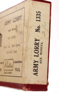 A rare early Britains made diecast model military vehicle No. 1335 ' Army Lorry - Six Wheels '. Green body, with white tyres and silver grille. Complete, with the tipper in working order. Possibly repainted. Supplied within its original box with lid. A rare model.