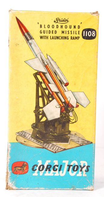 An original vintage Corgi Major Toys made diecast military model No. 1108 ' Bristol Bloodhound ' Guided Missile. Missing top rocket, and missile tip. Condition otherwise fair to good. With it's original box.