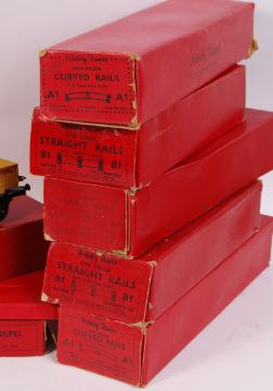 A large collection of original vintage Hornby Series 0 gauge trainset accessories and rolling stock. Largely boxed items, some loose, to include: CR1 Right Angle Crossing, No.2 Turntable, No.1 Lumber Wagon, Goods Brake Van, Buffer Stops, LMS Wagon, No.2 Double Arm Signal, No.1 Level Crossing, and some boxed track etc. Great collection.