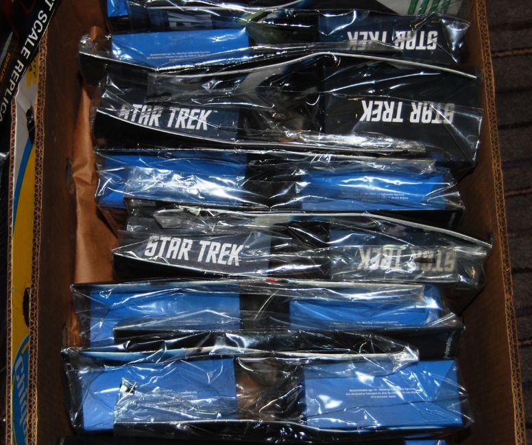 A rare complete run of Eaglemoss issued Star Trek magazines and accompanying diecast models. Complete run of issues 1-62 (+3 Special Issues), all still factory sealed and unopened within their original cellophane. Including free gifts, special editions, and the first carded issues. Each featuring a diecast model ship from the series. Spanning 4x boxes..Note: This lot can be posted WORLDWIDE. Postage to the UK on this lot will be £35+VAT, Europe from £40+VAT, USA & Canada from £60+VAT.(Lot Update: 25/1/19 12:04pm: Note: Description revision and the green bag is no longer included within this lot)