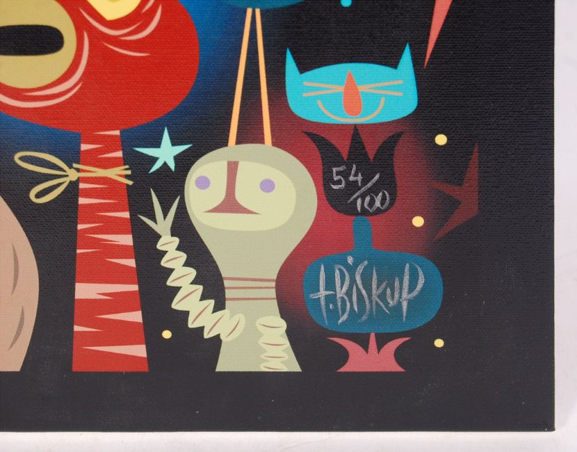 Tim Biskup - Samurai Jack - rare limited edition studio canvas print. No. 54/100. Signed by Biskup to the lower right corner in silver ink. The print depicting Samurai Jack and other characters. Measures approx; 68cm x 53cm. Unframed.