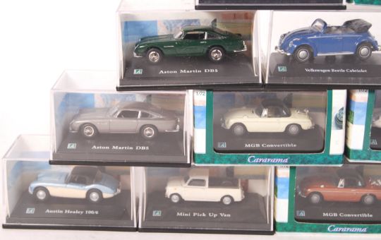 A collection of 13x assorted Cararama Hongwell 1:76 scale boxed diecast model cars. To include; Aston Martin DB5, Mini Pick Up Van, MGB Convertible, Austin Healey and otehrs. All contents appear mint, within the original boxes.