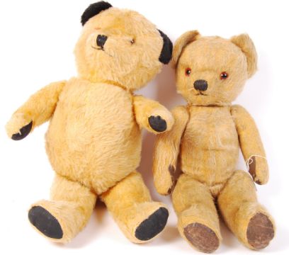 Two vintage mid-century / 1950's teddy bears. Comprising: a larger ' Sooty ' type bear with yellow mohair and black ears, and glass eyes. Along with a similar 1930's teddy bear ( possibly by Merrythought ) with golden mohair and leather pads. Tallest approx; 46cm.