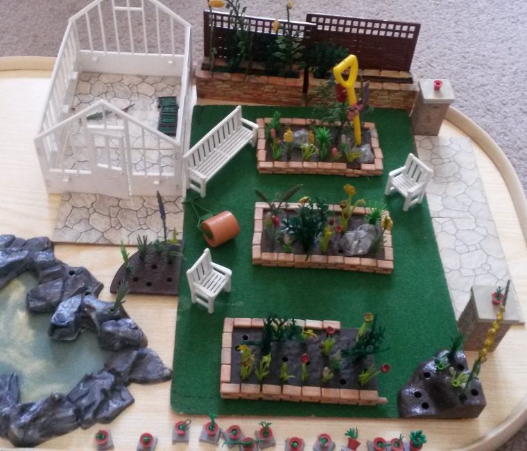 A charming collection of original vintage Britains made ' Floral Garden ' items and accessories. Highly detailed, to include; grass, plants, trellis, greenhouse, roller and other such items.