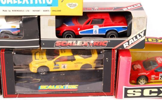 A good collection of 6x vintage boxed Scalextric slot racing cars. Comprising: C54 Lotus, C130 Triumph TR7, C139 Brabham, C429 RS 200, C130 Triumph TR7 and an SCX made 83460 Ford RS-200. All within their original boxes.