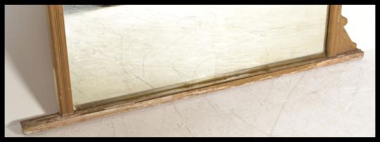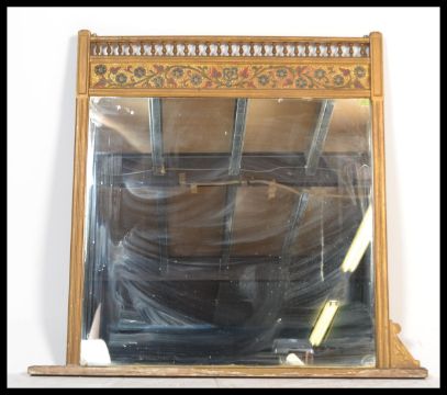 A large 19th Century gesso overmantel wall mirror, the gilt frame surmounted with a spindle gallery top over a decorated mosaic style panel, decorated with multi coloured floral swags, central mirrored panel flanked by gilt columns raised on a stepped base.  Measures: 125cm high x 138cm wide.